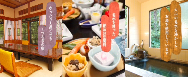 都会の喧噪を離れ、山麓を流れる大山川のせせらぎに耳を傾けながら湯に浸かれば、日頃の疲れも癒されゆったりとした時間が流れてゆくことでしょう。
